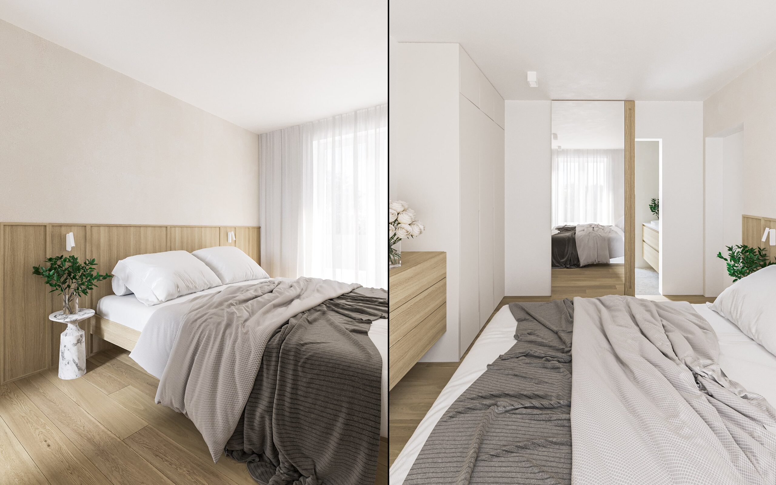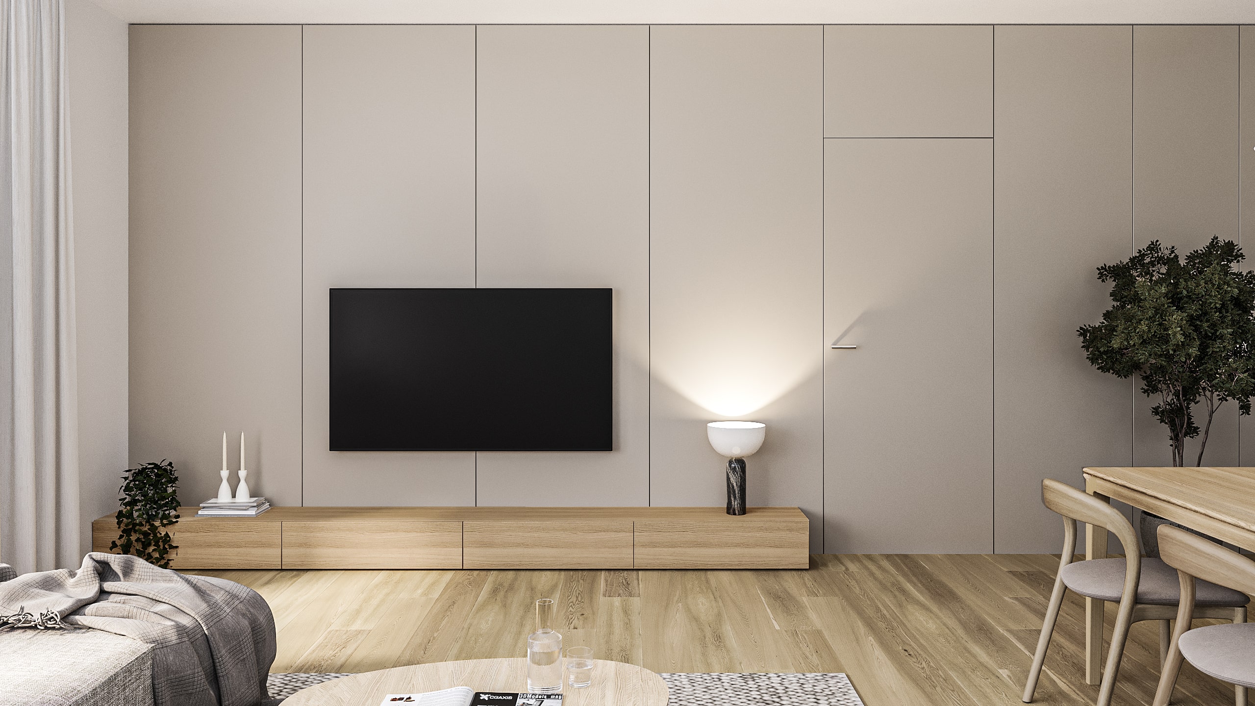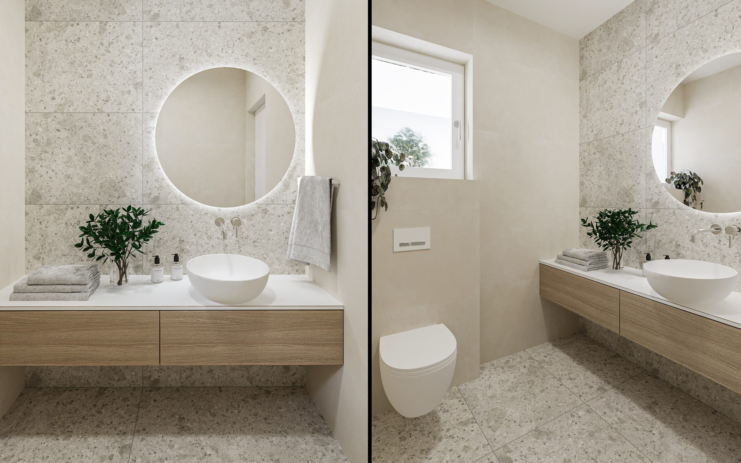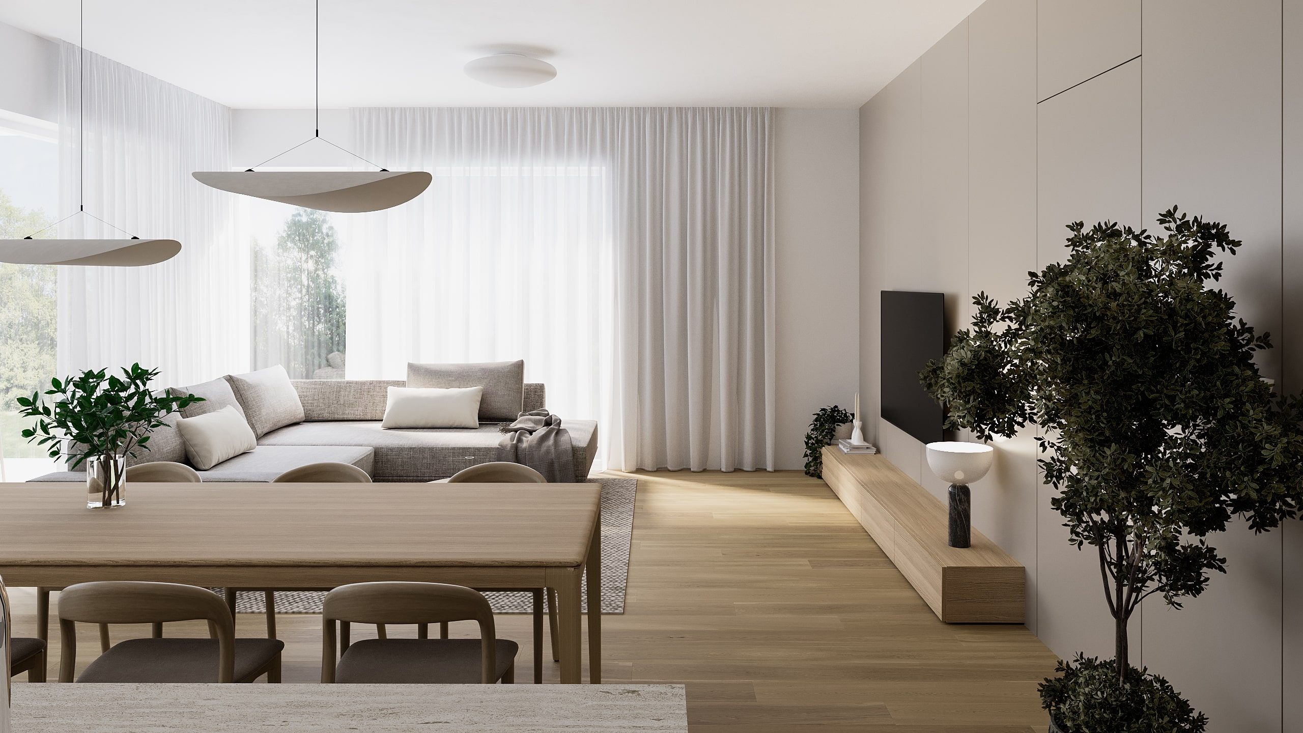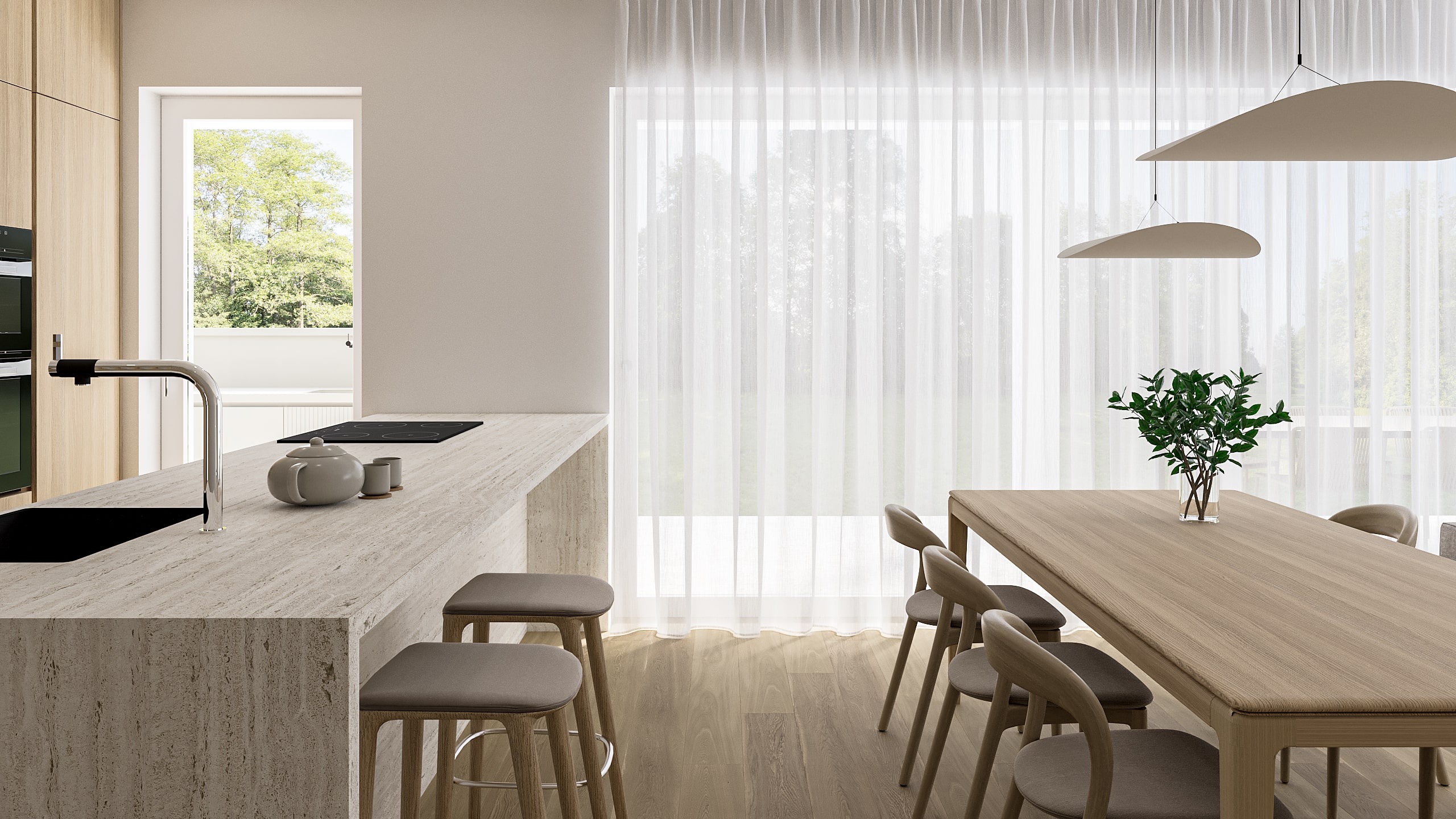 Ta hiša navdušuje z uporabo naravnih materialov in toplih tonov, ki prostoru dajejo prijetno in sproščeno atmosfero. Osrednji del bivalnega prostora je odprt in svetel, s širokimi steklenimi površinami, ki prostor povezujejo z zunanjostjo. Kuhinjski otok iz tehničnega kamna v imitaciji travertina postane elegantna osrednja točka, ki jo dopolnjujejo leseni elementi in keramika v toplih odtenkih.