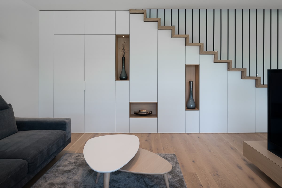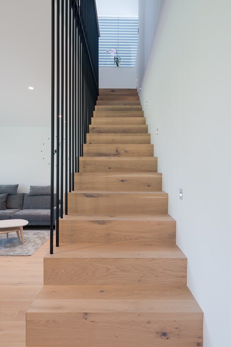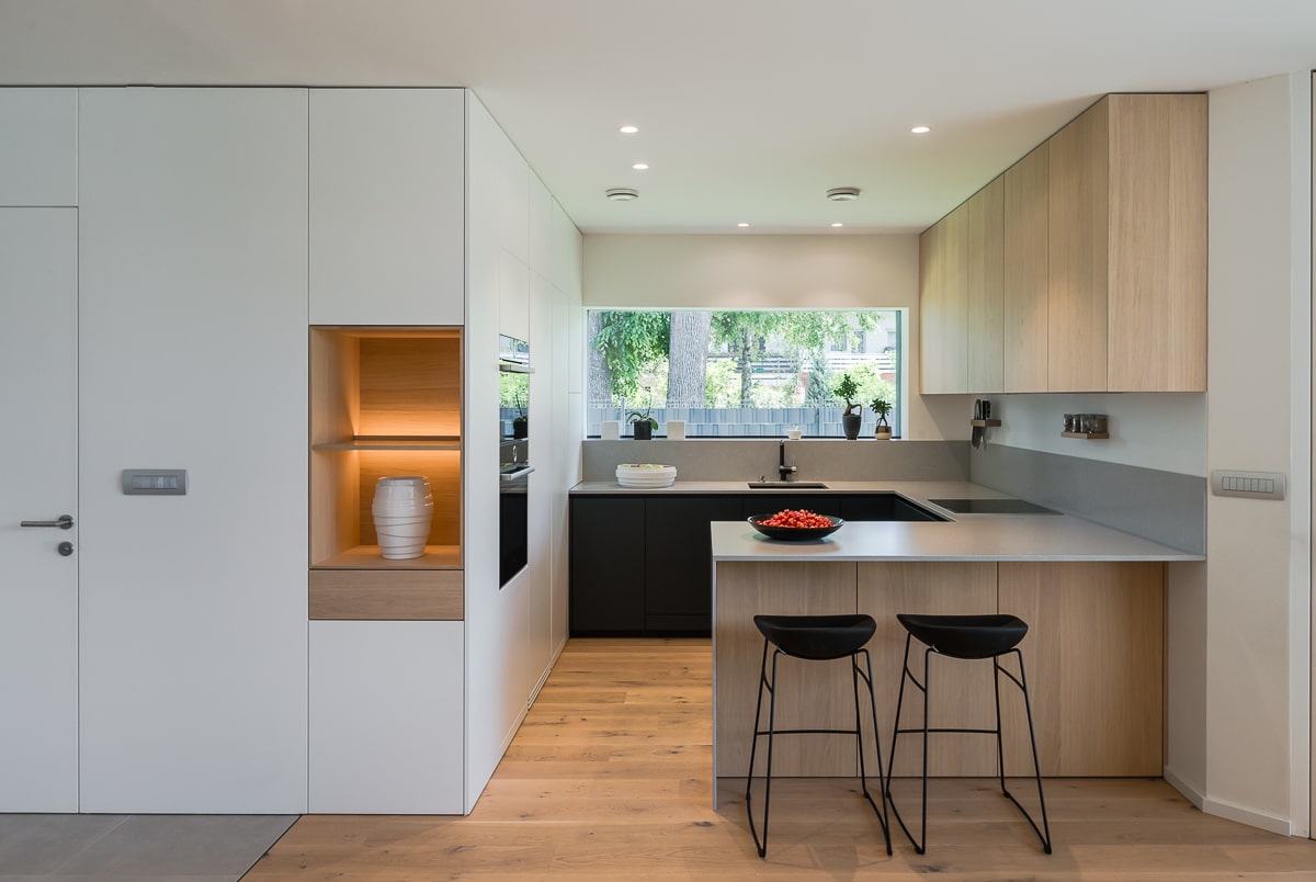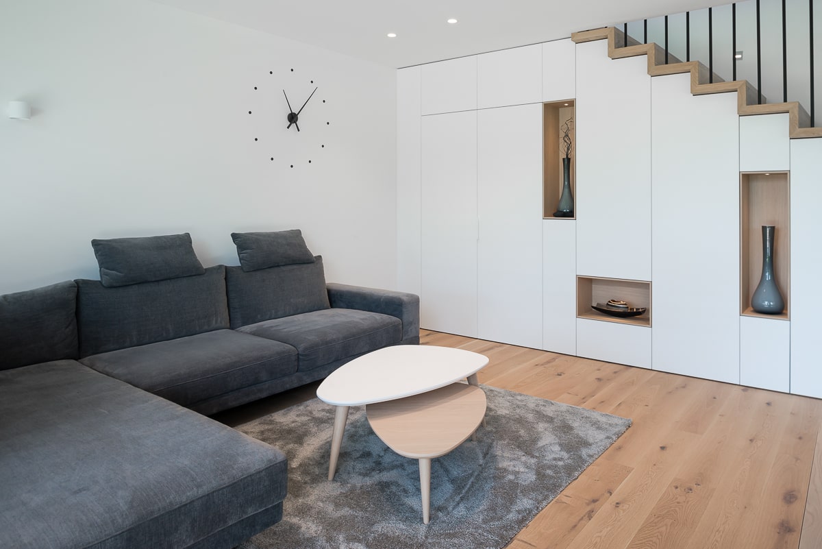 Moderna enodružinska hiša, kjer se naravni les prepleta s sofisticiranimi sivimi odtenki, ustvarja toplo in hkrati minimalistično vzdušje. Beljen hrastov parket daje prostoru svetlost in občutek zračnosti, medtem ko je vsak kotiček zasnovan z mislijo na funkcionalnost. Kuhinja je umeščena v diskretno nišo, kar ji omogoča, da se umakne iz glavnega prostora in ohranja čisto vizualno linijo. Konzolne stopnice skrivajo spodaj domačo pisarno, ki se lahko popolnoma zapre in tako ostane neopazna. Intimnost prostora dodatno poudarja vmesni element med jedilnico in dnevno sobo, ki deluje kot elegantna ločnica in obenem nudi shranjevanje, na primer za kozarce za posebne priložnosti. Celoten prostor združuje estetiko in praktičnost, hkrati pa ustvarja občutek domače topline in prefinjene umirjenosti.