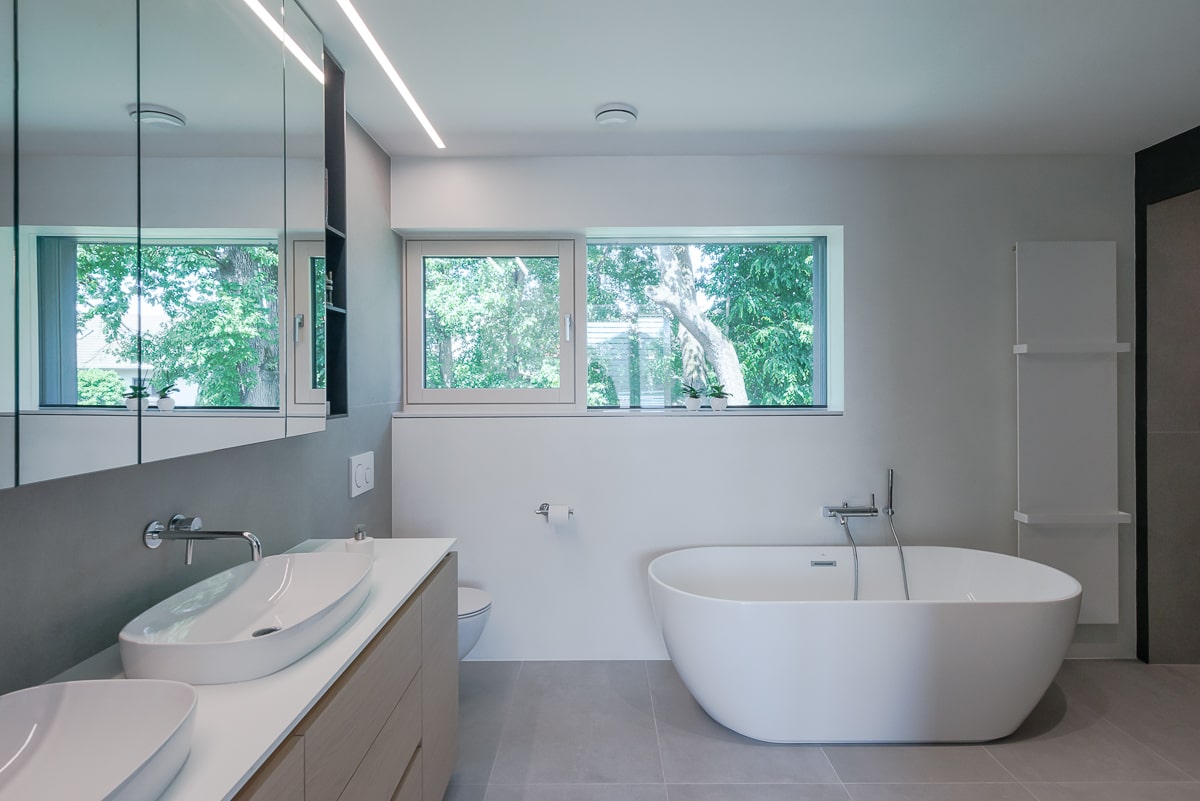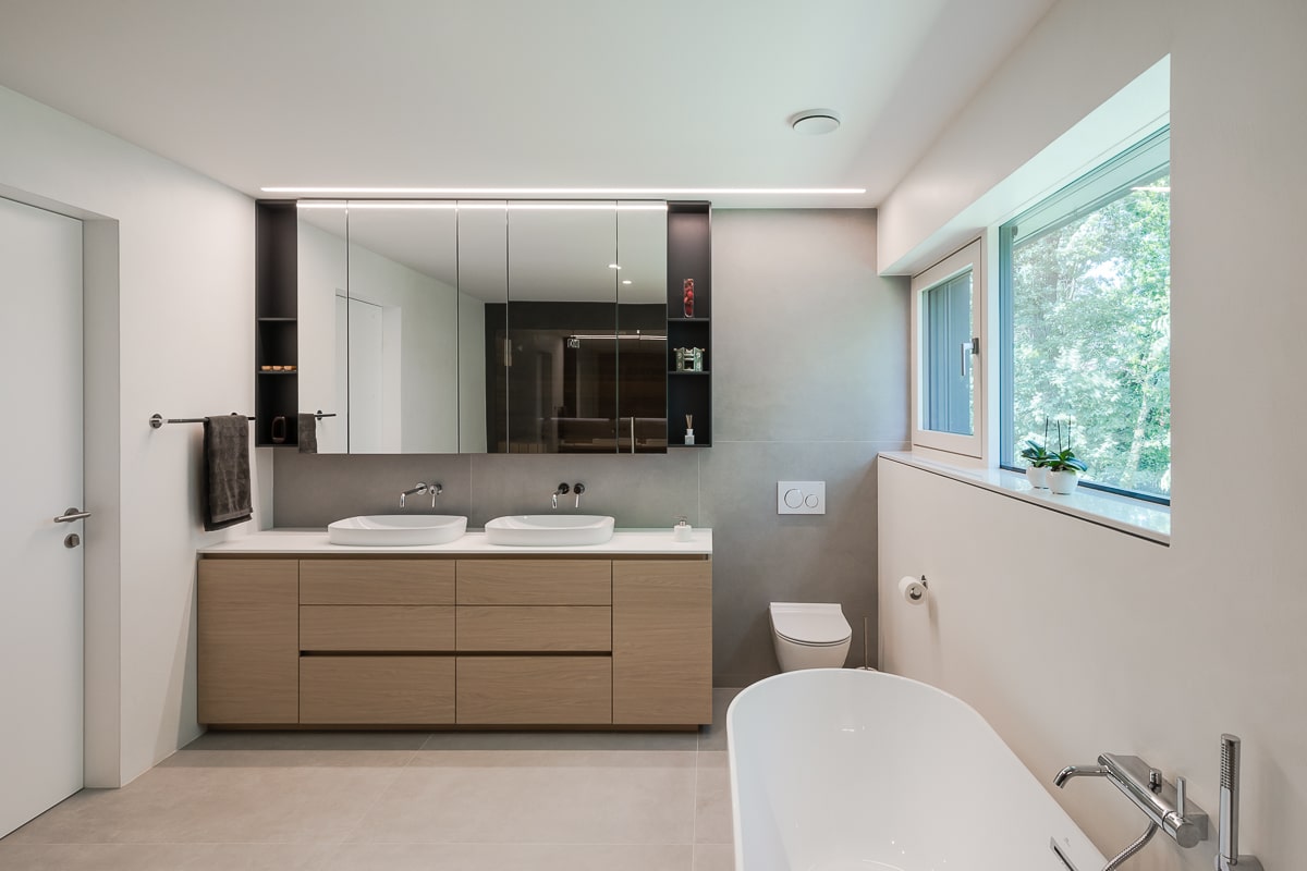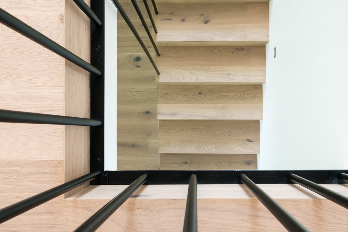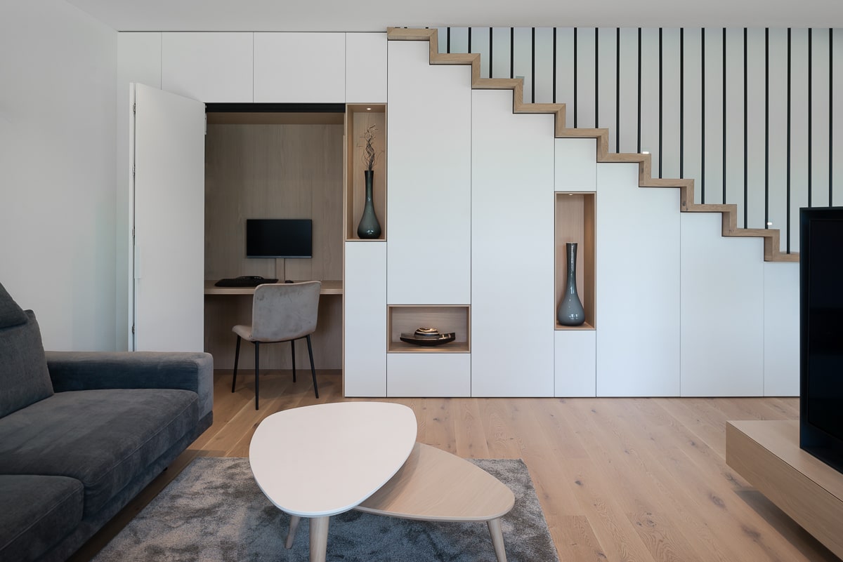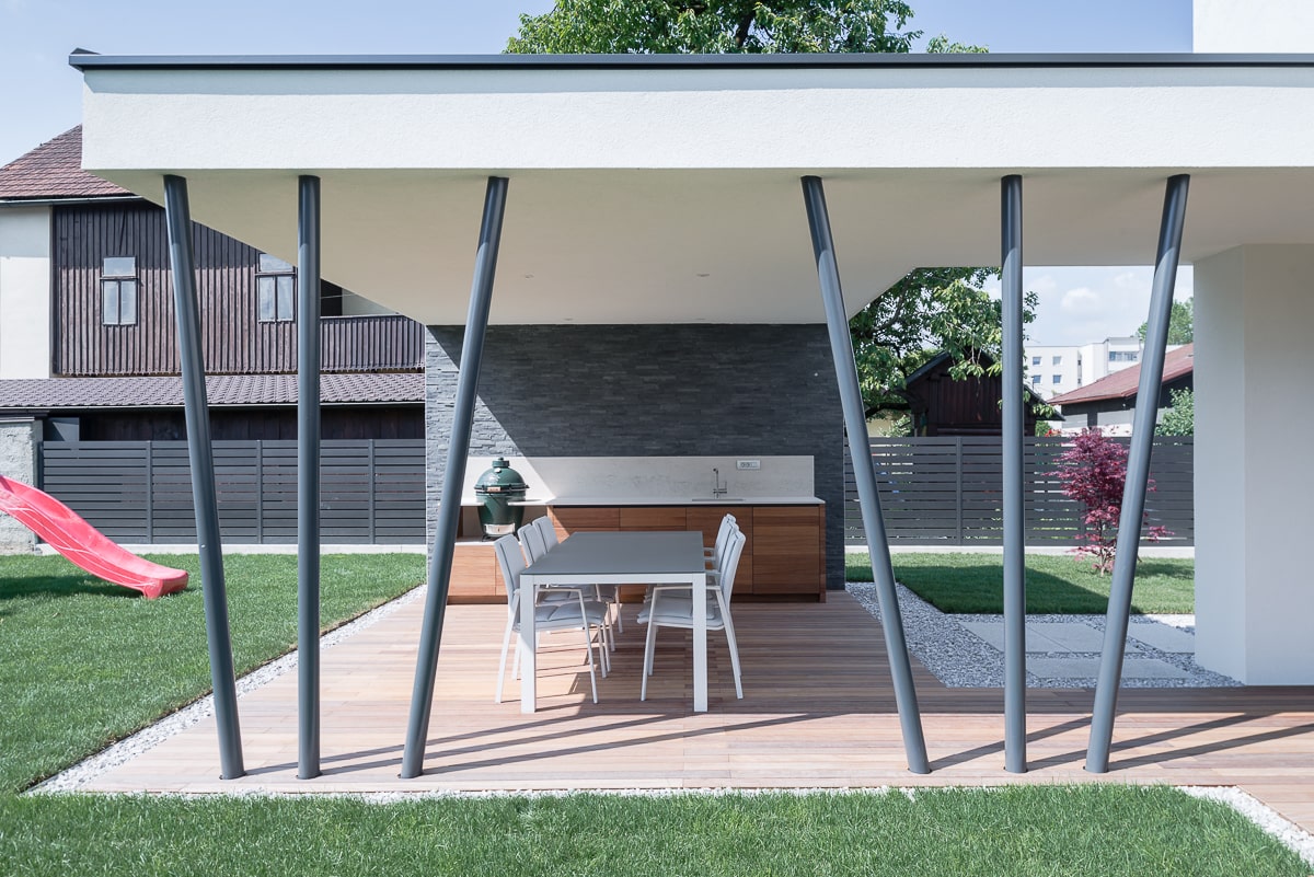 Moderna enodružinska hiša, kjer se naravni les prepleta s sofisticiranimi sivimi odtenki, ustvarja toplo in hkrati minimalistično vzdušje. Beljen hrastov parket daje prostoru svetlost in občutek zračnosti, medtem ko je vsak kotiček zasnovan z mislijo na funkcionalnost. Kuhinja je umeščena v diskretno nišo, kar ji omogoča, da se umakne iz glavnega prostora in ohranja čisto vizualno linijo. Konzolne stopnice skrivajo spodaj domačo pisarno, ki se lahko popolnoma zapre in tako ostane neopazna. Intimnost prostora dodatno poudarja vmesni element med jedilnico in dnevno sobo, ki deluje kot elegantna ločnica in obenem nudi shranjevanje, na primer za kozarce za posebne priložnosti. Celoten prostor združuje estetiko in praktičnost, hkrati pa ustvarja občutek domače topline in prefinjene umirjenosti.